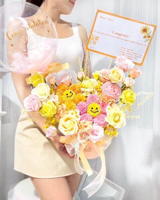 笑哈哈花|黃粉香皂花x保鮮花氣球祝賀花盒