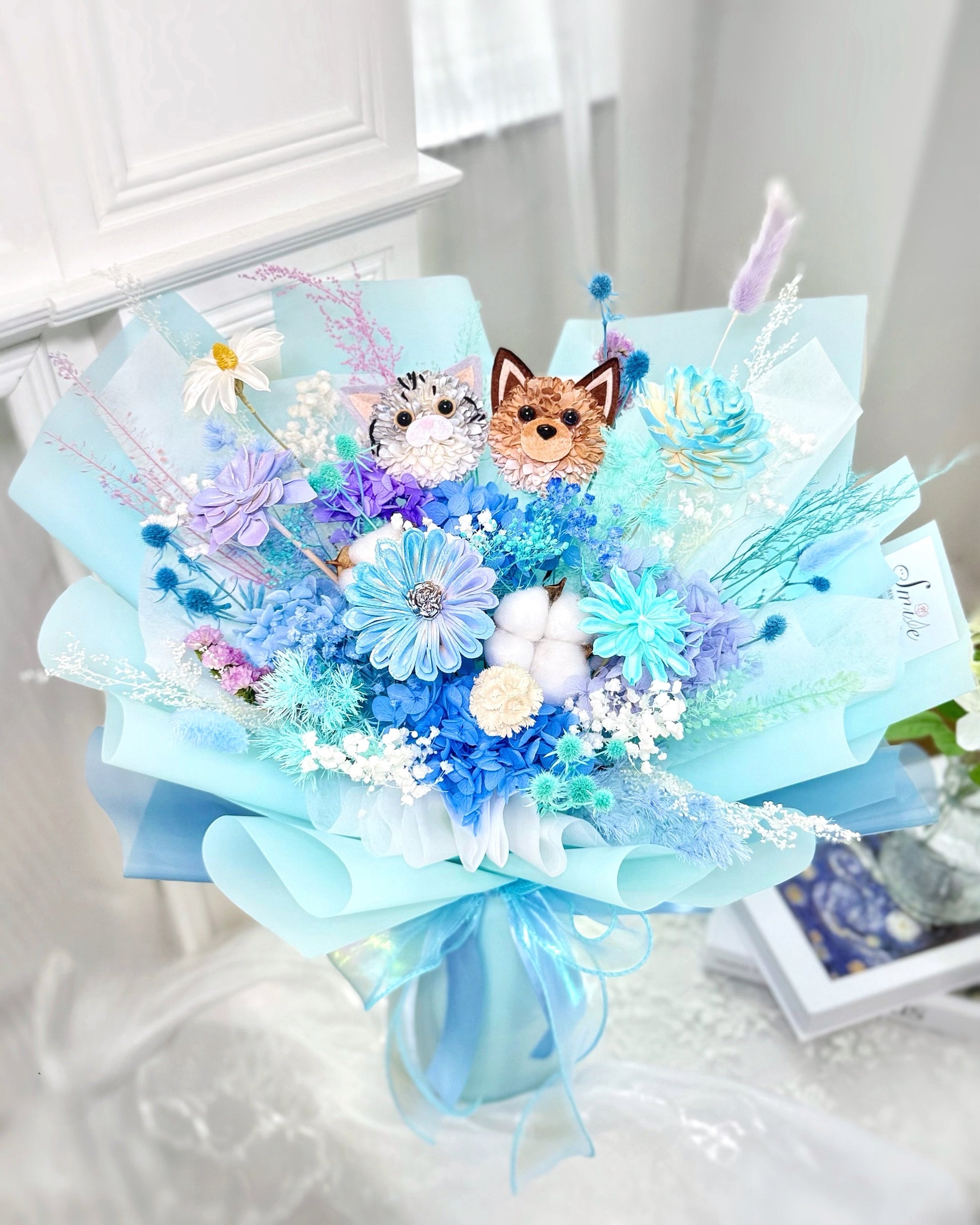 客製毛孩貓狗|M混藍紫木棉乾花x保鮮花花束