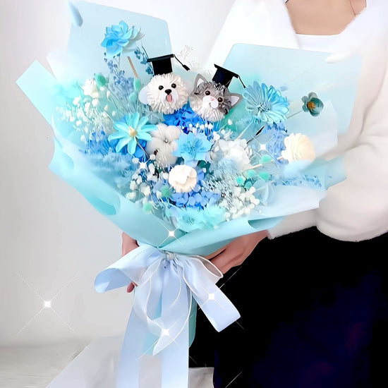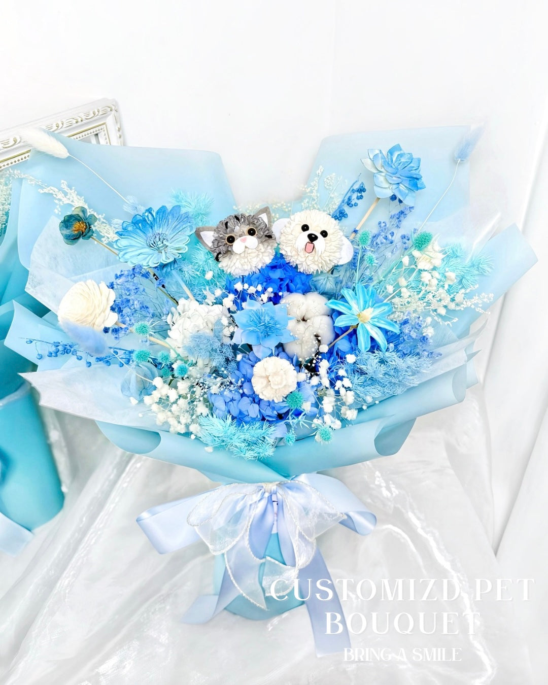 客製毛孩貓狗|M混藍白木棉乾花x保鮮花花束