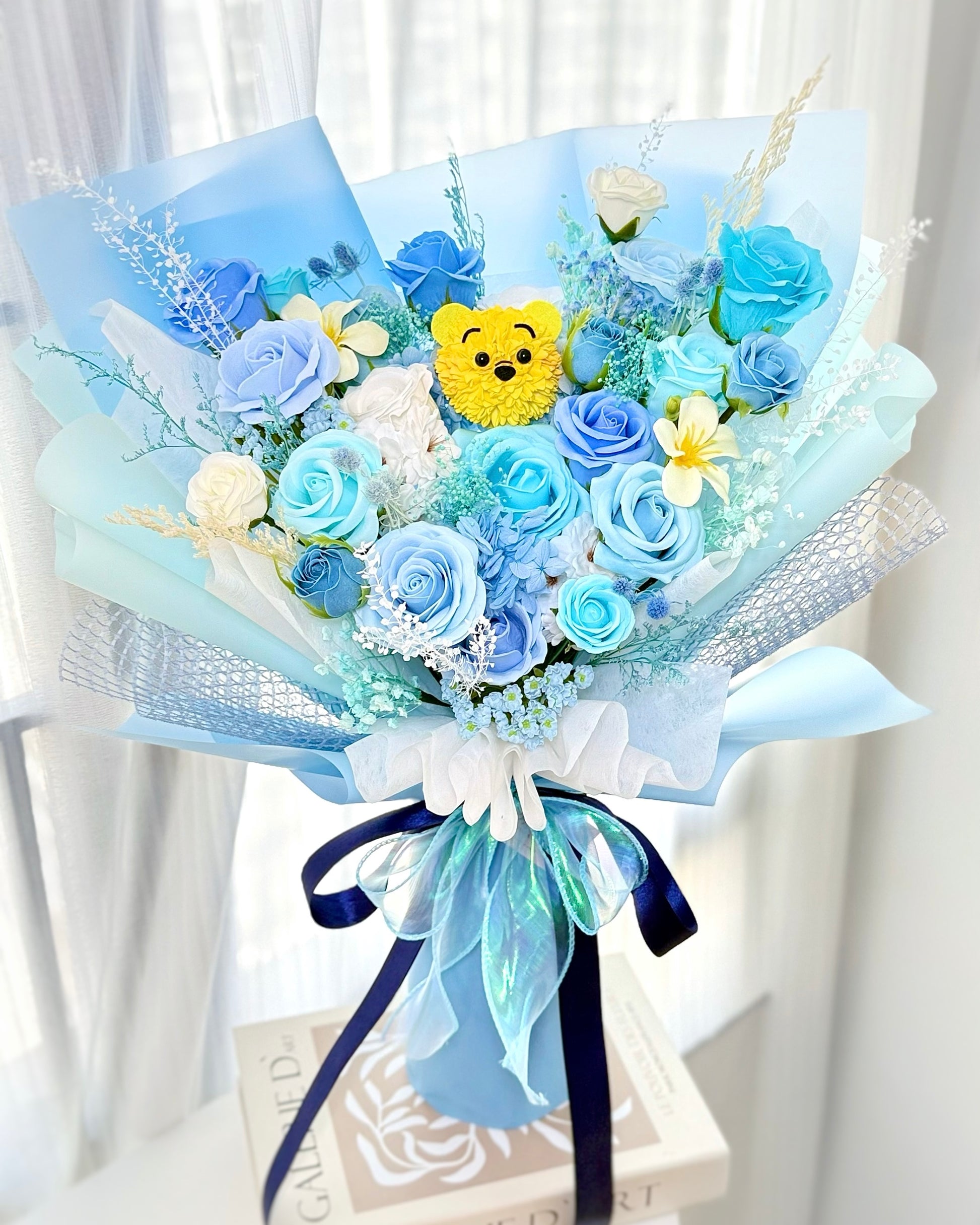 小熊維尼Winnie the Pooh|M混淺藍粉香皂花x保鮮花花束