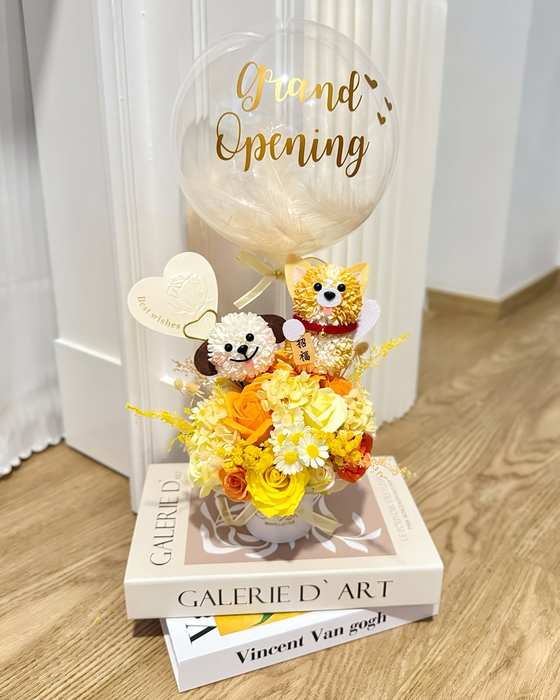 招財哥基小狗|黃橙小雛菊迷你氣球花盒