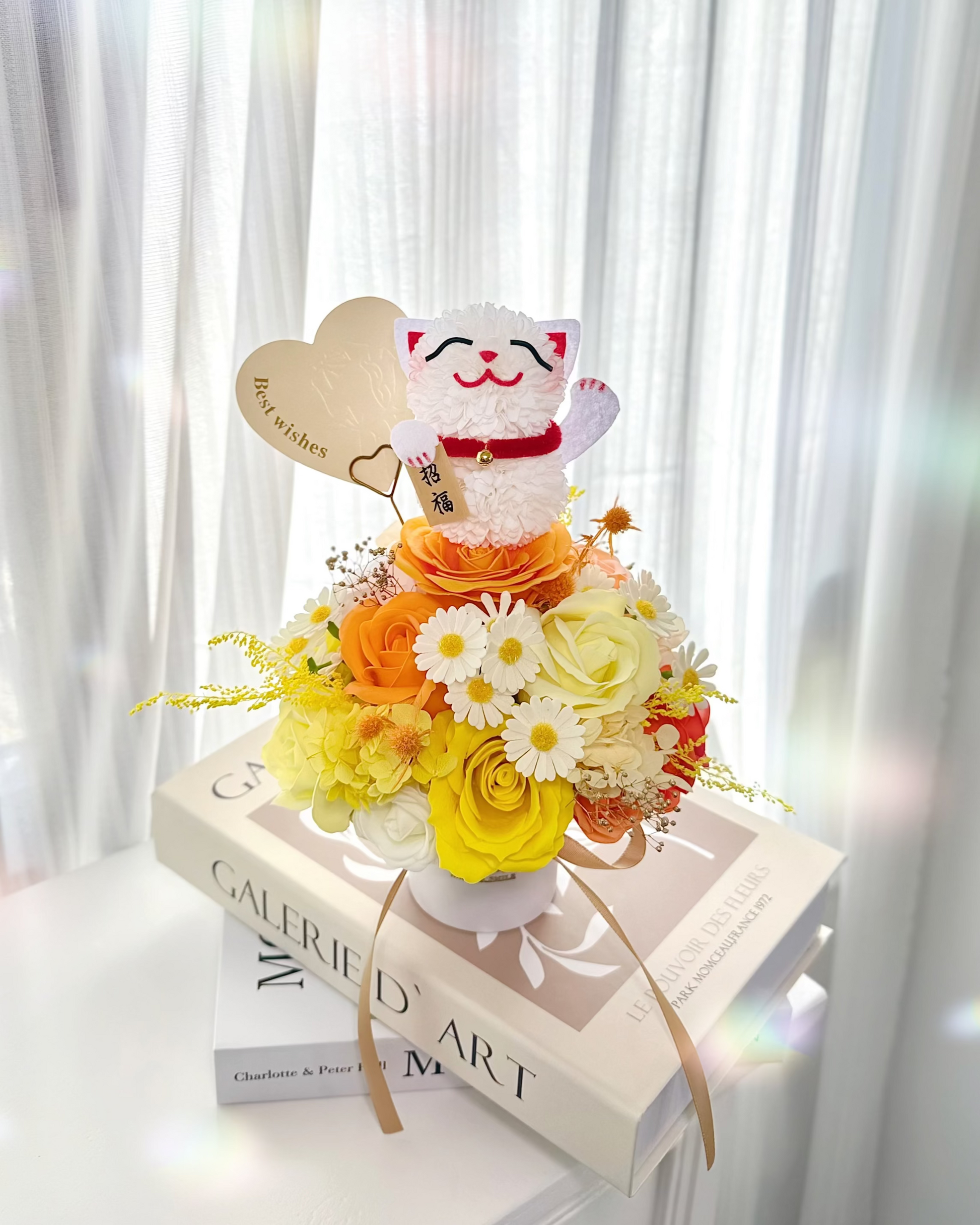 招財貓|黃橙小雛菊迷你座枱花盒