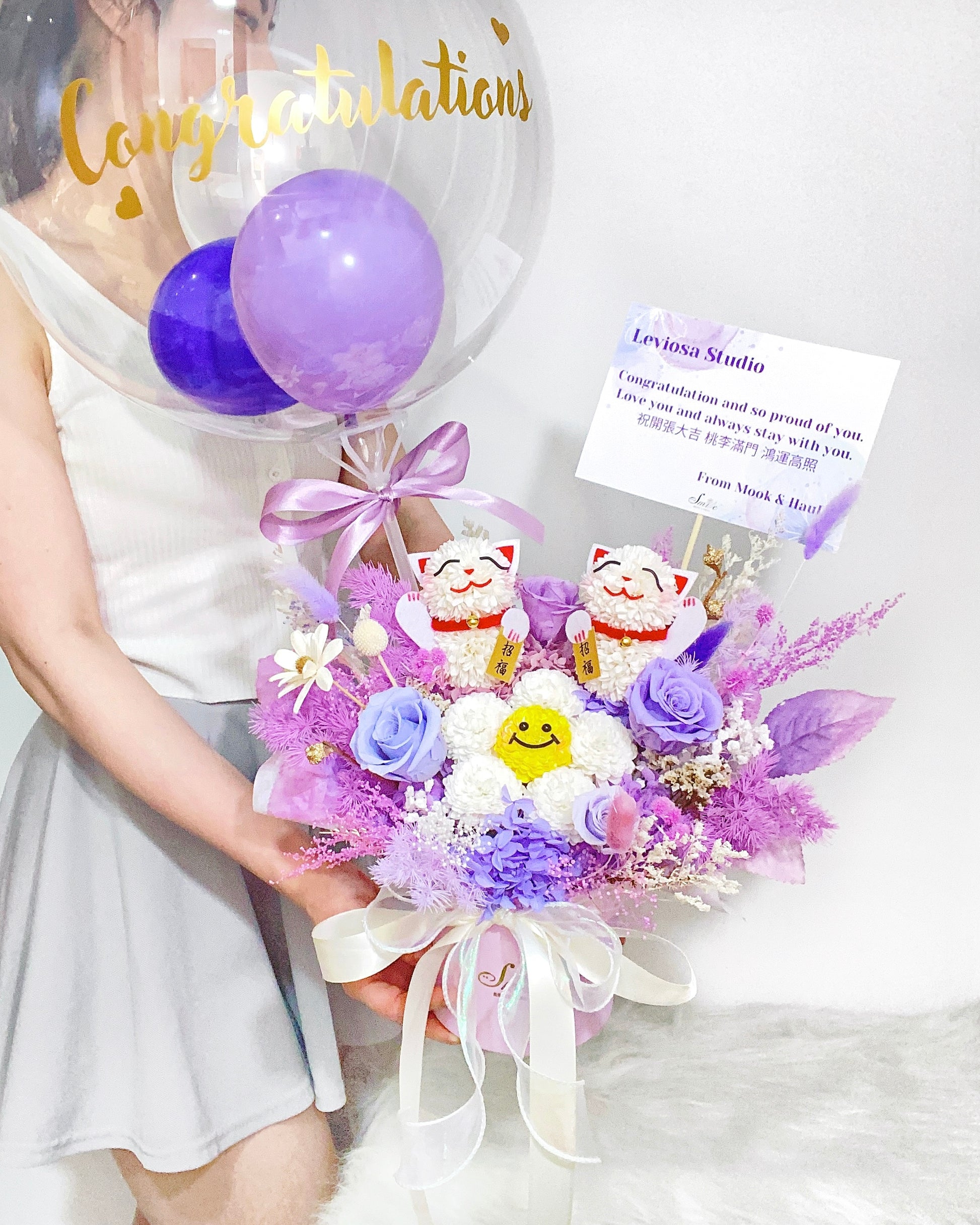 笑哈哈花及招財貓|混紫保鮮花氣球祝賀花盒
