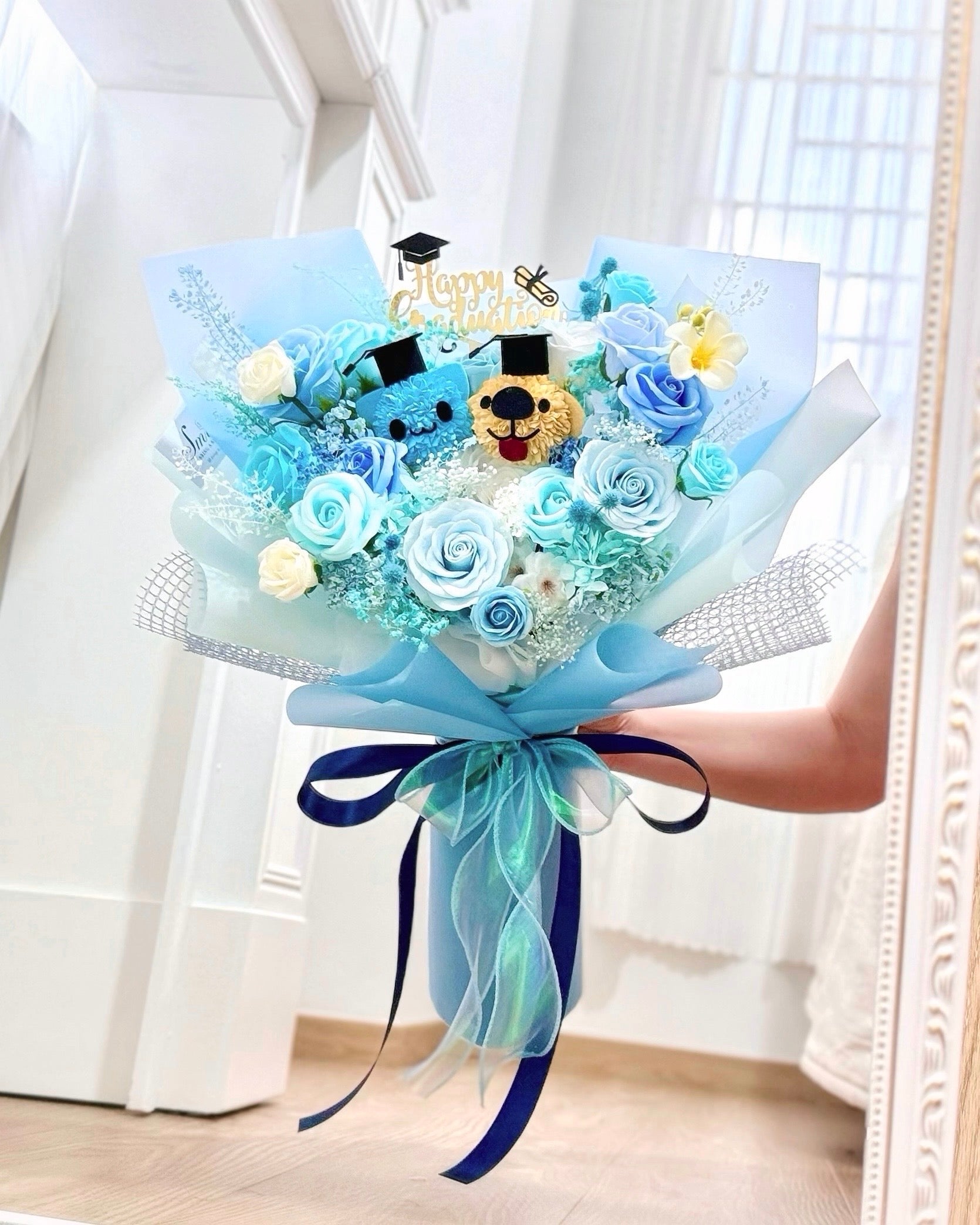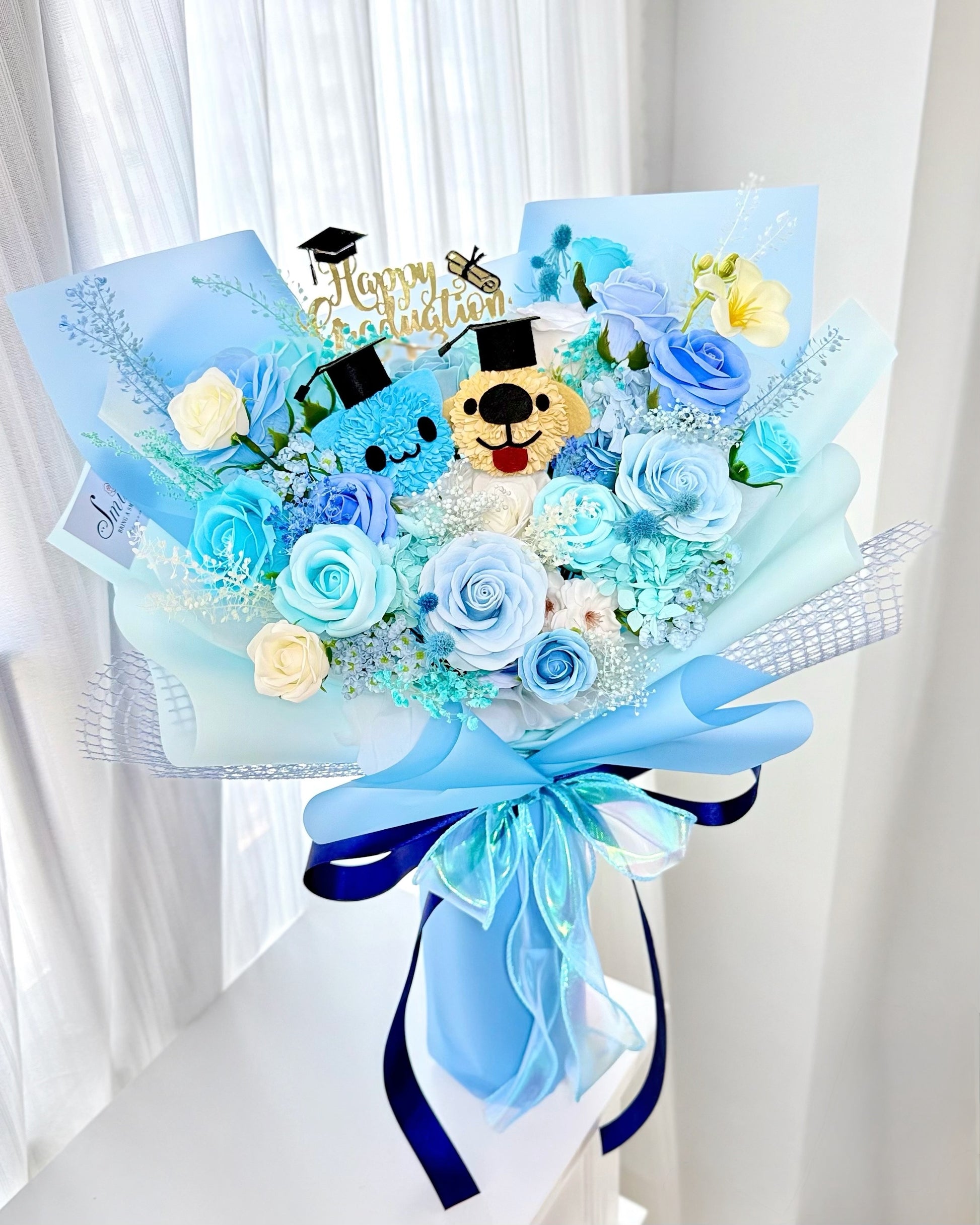 貓貓蟲咖波&狗狗|M混淺藍粉香皂花x保鮮花花束
